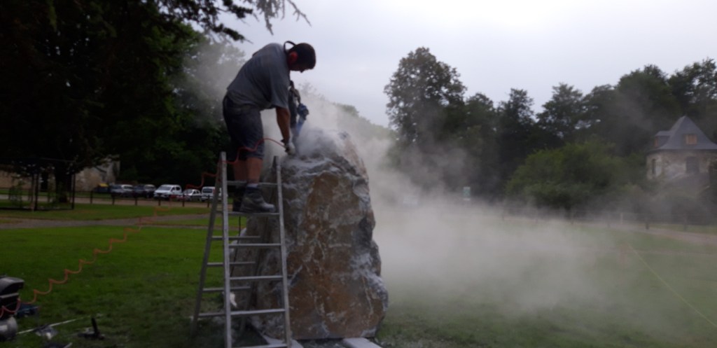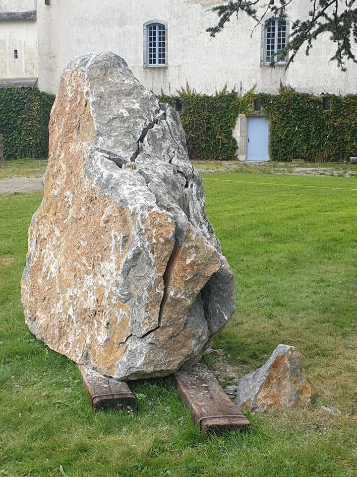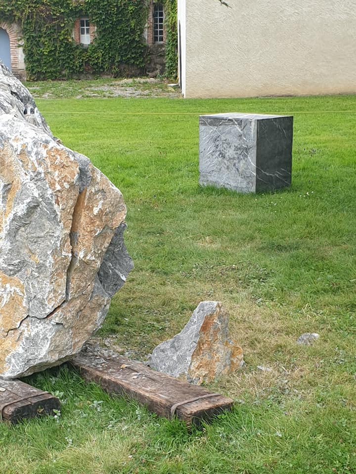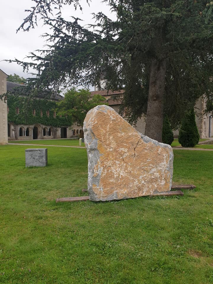 Nous avons choisi un bloc déjà transformé en parallélépipède dans le marbre dit « d’Arrudi » comme la roche brute en fissuration, car ce matériau est l’élément principal de construction de l’Abbaye de l’Escaladieu.